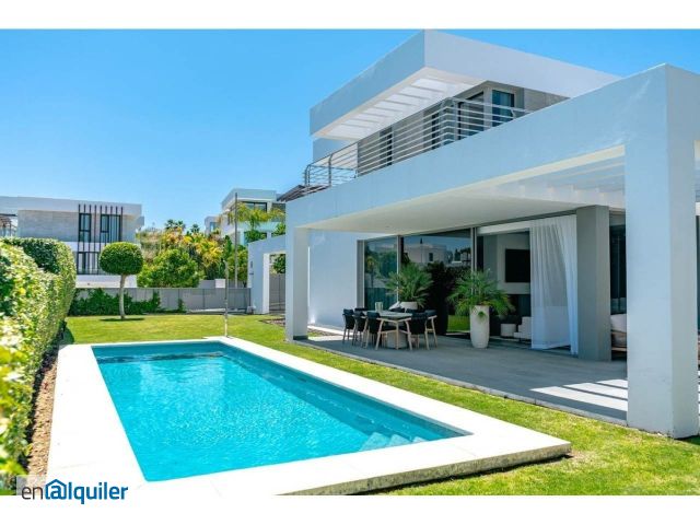 Villa de Lujo para Alquiler Vacacional en Cancelada Moderna Villa de 4 Dormitorios con Piscina Privada, Cine y Zona de Entretenimiento Disfruta de una escapada de alto nivel en esta impresionante villa moderna situada en Cancelada, a solo unos minutos en coche de la playa y del famoso Puerto Banús. Esta preciosa casa independiente es perfecta para familias, grupos de amigos o parejas que buscan espacio, comodidad y un toque de lujo. La villa cuenta con 4 amplios dormitorios, cada uno con su propio baño privado, ofreciendo privacidad y confort para todos. En el interior encontrarás muebles nuevos de estilo contemporáneo, una zona de estar y comedor de planta abierta, y grandes ventanales del suelo al techo que permiten la entrada de abundante luz natural y crean un ambiente luminoso y relajante. Pasa tus días tomando el sol junto a la piscina privada, viendo una película en la sala de cine o jugando una partida de billar en el salón de entretenimiento. En el exterior, hay una acogedora zona de estar, un comedor cubierto y un jardín tranquilo, ideal para disfrutar de comidas, bebidas o simplemente relajarte al aire libre. La propiedad también incluye dos plazas de aparcamiento privadas, lo que facilita y asegura el acceso para los huéspedes con coche. Ubicada a solo 5 minutos de la playa y a 15 minutos de Puerto Banús, estarás cerca de excelentes restaurantes, beach clubs, tiendas y todo lo que Marbella tiene para ofrecer, mientras disfrutas de un vecindario tranquilo y privado. Ya sea que estés buscando una escapada de lujo o una base con estilo para explorar la Costa del Sol, esta villa tiene todo lo que necesitas para una estancia inolvidable.