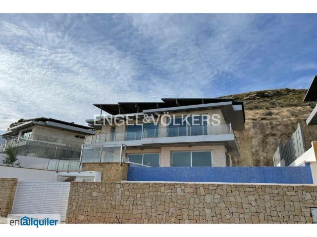 Solo alquiler larga temporada, minimo un año Villa moderna a estrenar con vistas al mar Esta Villa moderna a estrenar es muy espaciosa y se encuentra en la parte más alta de la urbanización Sierra Cortina. Debido a este hecho, las vistas son absolutamente espectaculares sobre el mar y las montañas. El inmueble se distribuye en tres plantas y todas están interconectadas por escaleras y un ascensor. Nada más entrar en la propiedad se accede a la zona de aparcamiento con un garaje diáfano de unos 170 metros cuadrados con espacio para varios coches y el resto del espacio se puede utilizar como zona de juegos infantiles, sala de música o cine en casa. También hay un baño en esta misma planta. Subiendo por las escaleras o por el ascensor se llega a la primera planta donde se encuentra la cocina con todos los electrodomésticos necesarios, un comedor y una sala de estar desde donde se pueden disfrutar de las hermosas vistas al mar. También se puede acceder a la piscina desbordante en forma de "L" y la terraza exterior directamente desde la misma planta. En la segunda planta podemos encontrar los tres dormitorios con sus tres baños correspondientes. Todas las habitaciones tienen acceso a una terraza exterior, tienen vistas al mar y están equipados con aire acondicionado. Las terrazas de esta planta tienen unos 50 metros cuadrados aproximadamente y este es un lugar perfecto desde donde se puede disfrutar de la puesta de sol y el amanecer. Hay que mencionar que el suelo en toda la propiedad es de una combinación de mármol y madera, lo que da una sensación muy cómoda y agradable. La propiedad ha sido completamente reformada recientemente y las calidades de los acabados tienen que ser mencionadas también. Alarma de seguridad, video portero, persianas eléctricas, son solo algunos de los muchos elementos que se pueden encontrar. Con el fin de obtener una mejor idea de lo que la propiedad tiene para ofrecer, le recomendamos que programe una visita con nosotros. A los pies de la Sierra Cortina se sitúan numerosas urbanizaciones. Su enclave es privilegiado por su cercanía a los lugares más importantes y a todos los servicios primarios y necesarios. Igualmente está a muy pocos minutos del campo de golf ?Villaitana?, de los lujosos hoteles de cinco estrellas ?Asia Gardens? y ?Meliá Villaitana?, del peaje de la autovía A7 y de los preciosos pueblos y montañas que nos rodean. El municipio de Finestrat está situado a 10 minutos de Benidorm, ubicado en el corazón de la Costa Blanca y rodeado de importantes localidades como Alicante, Benidorm, Torrevieja, Elche, Altea o Calpe. Además dispone de una fácil conexión por autopista al Aeropuerto Internacional de Elche-Alicante, desde donde conectamos rápidamente tanto con las grandes capitales nacionales Madrid y Barcelona, como europeas. Finestrat es un pintoresco municipio costero y al mismo tiempo montañoso que combina el silencio de la naturaleza rocosa y verde de las elevadas cumbres del Puig Campana con la atracción cosmopolita de su Cala, destino familiar y pacífico. El casco histórico de Finestrat emerge ante la mirada del visitante, elevado sobre un cerro muy abierto de apenas 238 metros sobre el nivel del mar y a los pies del impresionante Puig Campana. A pie por las calles y plazas de Finestrat, se respira el oxígeno de sus cercanos pinos y la fragancia de sus antiguos huertos de almendros, olivos y algarrobos. A tan sólo 9 km, se encuentra la Cala de Finestrat, cuya playa de arena dorada y aguas cristalinas es un tesoro rodeado de zonas residenciales.