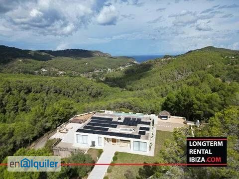 ANNUAL RENTAL - SAN MIGUEL. Located in the quiet hills of San Miguel, this elegant villa offers a year-round retreat immersed in Ibiza?s northern countryside. Surrounded by mature trees and natural beauty, the property enjoys partial sea views toward the island?s north coast, creating a peaceful and authentic atmosphere. The villa features five spacious double bedrooms, each designed for maximum comfort, along with five modern bathrooms. The heart of the home is its generous open-plan living space, combining a fully equipped kitchen, dining area, and lounge?ideal for entertaining or relaxing with family. The interiors are fitted with underfloor heating, air conditioning throughout, smart TV, sound system, and high-speed WiFi, ensuring comfort in every season. Outdoors, a saltwater infinity pool invites you to unwind while enjoying the surrounding landscape. The chill-out and alfresco dining areas are perfect for sunset gatherings or long summer lunches. A full security system and electric gate provide added peace of mind. The property is completely self-sufficient and eco-friendly: water will be supplied from a newly constructed private borehole, and electricity is generated via solar panels. Both utilities are included in the rental price, as is the regular maintenance of the garden and pool. This is a unique opportunity to enjoy privacy, nature, and modern comfort in one of the most peaceful and scenic areas of the island?yet still within a short drive to the village of San Miguel and nearby beaches. Schedule a viewing with our agent.
