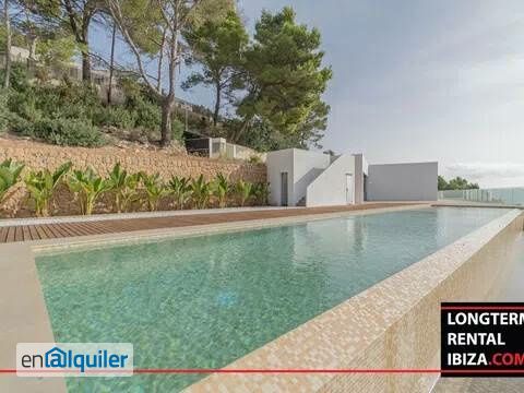 ANNUAL RENTAL - ES CUBELLS. Incredible villa located on one of the most prestigious areas of ibiza with and beautiful view to the valley and sea. This villa has five bedrooms all en suite with the views to the sea. The property is completely fenced with an electric gate that leads to a very spacious private garage that fits a big car collection. To access to the villa we can enjoy a nice walk corridor full of tropic trees. Entering to the villa we find a spacious living room with sea view with an open kitchen, next to the kitchen we have a private storage room with sink. From the main entrance walking to the right we fin two suite rooms with open dressing room and bathrooms, boths with views to the sea. The third room is a master room with private jacuzzi, opened dressing room, and private bathroom. From the master room we have a direct access to the pool and views to the valley and sea. Now walking from the main entrance to the left we have a guest bathroom and two beautiful rooms en suite with open dressing rooms and views to the valley and sea. Stairs down we have a laundry room and the spacious garage. All the villa has integrated air conditioning hot/cold. The villa is furnished wit Maison de L?elephant. Schedule your viewing with our agent.