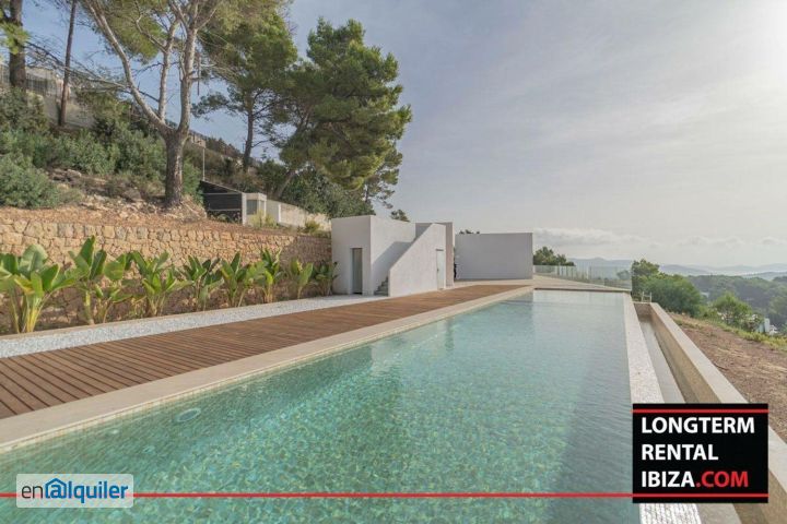 ANNUAL RENTAL - ES CUBELLS. Incredible villa located on one of the most prestigious areas of ibiza with and beautiful view to the valley and sea. This villa has five bedrooms all en suite with the views to the sea. The property is completely fenced with an electric gate that leads to a very spacious private garage that fits a big car collection. To access to the villa we can enjoy a nice walk corridor full of tropic trees. Entering to the villa we find a spacious living room with sea view with an open kitchen, next to the kitchen we have a private storage room with sink. From the main entrance walking to the right we fin two suite rooms with open dressing room and bathrooms, boths with views to the sea. The third room is a master room with private jacuzzi, opened dressing room, and private bathroom. From the master room we have a direct access to the pool and views to the valley and sea. Now walking from the main entrance to the left we have a guest bathroom and two beautiful rooms en suite with open dressing rooms and views to the valley and sea. Stairs down we have a laundry room and the spacious garage. All the villa has integrated air conditioning hot/cold. The villa is furnished wit Maison de L?elephant. Schedule your viewing.