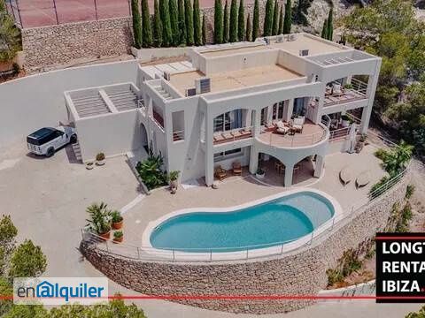 ANNUAL RENTAL - CAN RIMBAU. Elegant 6-Bedroom Villa with Panoramic Views in a Prestigious Gated Community Located in the exclusive and secure urbanization of Can Rimbau, this newly reformed villa combines understated elegance with exceptional comfort and world-class views. Set on an elevated 2,100 m² plot, the home boasts sweeping vistas of the Mediterranean Sea, Formentera, and the UNESCO World Heritage Site of Dalt Vila. The 355 m² property features six spacious bedrooms and five bathrooms, offering ample space for families or professionals seeking privacy and sophistication. The open-plan living room is flooded with natural light and connects to a sleek, fully equipped kitchen, ideal for both daily living and entertaining. With four generous terraces, the villa offers seamless indoor-outdoor living. Whether enjoying al fresco meals or simply relaxing under the sun, every corner of the house frames a postcard-perfect view of Ibiza Town and the sparkling coastline. The home maintains a refined minimalist aesthetic, with carefully selected designer furniture and flawless finishes throughout. Additional features include air conditioning in all bedrooms, double-glazed windows, a private garage, a private tennis court, and a beautiful swimming pool set against the backdrop of Ibiza?s most iconic skyline. A rare opportunity to live in one of the island?s most sought-after gated communities with 24/7 security and unbeatable convenience. Schedule a viewing with our agent.