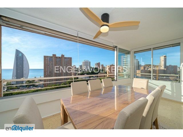 Piso de alquiler de 3 dormitorios en Playa de Poniente, Benidorm Solo alquiler larga temporada, minimo 1 año Si busca un alquiler en Benidorm que combine altura, espacio y una ubicación inmejorable, este piso en la planta 10 cerca de la Playa de Poniente es una opción excelente. Con una superficie de 110 metros cuadrados, la vivienda destaca por ser muy luminosa y por ofrecer vistas despejadas al mar, a las zonas verdes comunitarias, y a la montaña. El salón comedor es amplio y cómodo, conectando directamente con una terraza acristalada de gran tamaño con orientación sur, lo que garantiza luz natural durante todo el día y un espacio extra ideal para relajarse frente a la costa. La distribución es muy práctica y funcional para el día a día, contando con tres dormitorios con buen espacio de almacenaje y dos baños completos. La cocina ha sido reformada recientemente con un estilo moderno y actual, y el piso se entrega totalmente amueblado y listo para entrar a vivir. Además, para mayor comodidad, la vivienda dispone de aire acondicionado y cuenta con una plaza de parking incluida en el mismo edificio, algo fundamental en esta zona. El edificio se encuentra dentro de un residencial muy completo y bien cuidado, pensado para disfrutar del tiempo libre sin salir de casa. Los inquilinos tienen acceso a amplias zonas verdes con jardines, una piscina comunitaria de buen tamaño, dos pistas de tenis, pista multideporte, barbacoa, y un parque infantil con columpios para los más pequeños. Es una oportunidad ideal para vivir junto a la Playa de Poniente, en un entorno tranquilo pero con todos los servicios y el mar a solo unos pasos de distancia. Benidorm es la capital por excelencia de la Costa Blanca, foco turístico principal de todo el litoral levantino, donde encontramos también importantes localidades como Alicante, Torrevieja, Elche, Villajoyosa, Altea, o Calpe. Benidorm es un lugar enigmático y único, conocido desde el punto de vista urbanístico como el Manhattan español. Ciudad atractiva sobre todo por su microclima gracias a su orientación sur y a la protección que ejercen las montañas que la rodean y que ofrece a sus habitantes inviernos templados y veranos agradables. Su situación privilegiada frente a una bellísima bahía de dos playas de arena dorada con aguas cristalinas y cálidas, y la gran oferta de servicios, ocio, campos de golf cercanos, clubes náuticos, restauración, etc? la convierten en una ciudad paraíso para vivir con comodidad, tranquilidad y diversión. Este Apartamento está a escasos metros de playa Poniente, la mejor playa de Benidorm. El centro cuidad está a menos de cinco minutos con coche y presume de rápida comunicación con carretera nacional N-322 y salida a la Autovía del Mediterráneo. El Aeropuerto internacional de Alicante está a 40 km de distancia y Valencia, Ciudad de las Artes a 150 km.