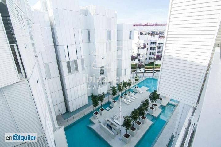 Se alquila para toda la temporada de verano, desde el 1 de mayo hasta el 31 de octubre por 4.833 /mes - total 29.000 A PAGAR POR ADELANTADO. Contacte por email, no podemos atenderle por móvil.  Moderno piso de diseño en el edificio Patio Blanco del reconocido arquitecto Jean Nouvel. El apartamento tiene una superficie de 90 m2 distribuidos en dos dormitorios, un baño, moderna cocina abierta con isla de cocina, salón y comedor con acceso directo a la terraza. El apartamento es completamente blanco con algunos toques de color. La vivienda dispone de aire acondicionado frío-calor, ascensor, plaza de garaje y piscina comunitaria. El apartamento está ubicado en Botafoch, una de las zonas residenciales más exclusivas y deseables de la isla. La playa de Talamanca, el puerto de La Marina y el casco antiguo se encuentran a pocos minutos a pie. Para entrar a vivir hay que entregar el importe de todas las mensualidades por adelantado (29.000 ) + 1 mes (4.833 ) de fianza + 1 mes (4.833 ) de comisión de agencia (+ I.V.A.). El wifi, el agua y la electricidad se pagan aparte. Contacte con nosotros por correo electrónico, estaremos encantados de concertar una cita con usted para ver la propiedad. Tenemos muchas mas casas, villas, apartamentos, pisos, fincas, estudios, locales comerciales y terrenos en alquiler y venta en la isla. Gracias por considerarnos como su agencia inmobiliaria en Ibiza.