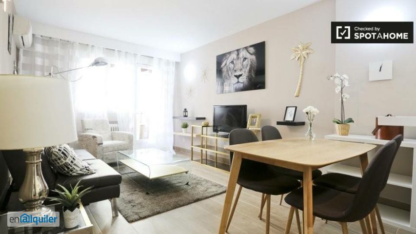 Un elegante apartamento de 1 dormitorio con un hermoso balcón y aire acondicionado está disponible para alquilar en Prosperidad. El apartamento tiene una hermosa sala de estar, donde podrá relajarse en el hermoso sofá y ver sus programas favoritos en la televisión después de un largo día explorando la ciudad. La cocina tiene todo lo que necesita para cocinar una tormenta, incluyendo un horno, un microondas y un lavaplatos para una limpieza rápida. La habitación tiene mucha luz natural, y está bien amueblada con una gran cama doble y mucho espacio de almacenamiento para todas sus cosas en el armario independiente. En el baño moderno, encontrarás una enorme ducha a ras de suelo. ¡Lujoso! Vivirás en Prosperidad, un vecindario tranquilo y bien conectado al norte del excitante centro de la ciudad de Madrid. Alrededor del apartamento, encontrarás muchos restaurantes, cafeterías, bares y tiendas para disfrutar. Y, con 2 estaciones de metro en la misma calle, ¡nunca estarás lejos de cualquier cosa en Madrid!