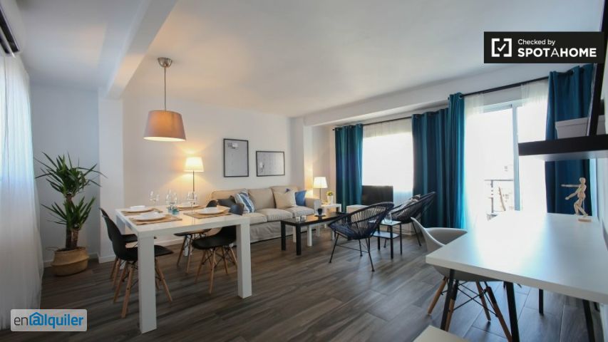 Descubra este fantástico apartamento exterior de 2 dormitorios en alquiler en Torrefiel, Valencia. Totalmente amueblado y equipado con todo lo esencial, como lavadora, horno y tv, este apartamento ofrece una experiencia de vida cómoda. Los residentes pueden disfrutar de un hermoso balcón o terraza, perfecto para relajarse o disfrutar de actividades al aire libre. La propiedad es ideal para profesionales y estudiantes de posgrado, y ha sido revisada por Spotahome para su tranquilidad. Tenga en cuenta que, aunque el apartamento no dispone de ascensor ni aire acondicionado, se permite fumar y no es apto para mascotas. Además, la ropa de cama está incluida en el alquiler. Torrefiel es un encantador barrio de Valencia conocido por su variedad de restaurantes informales. Cerca del apartamento, encontrará lugares convenientes como Dinars Comidas Para Llevar y la Bomba Casa de Comidas a un corto paseo. Para compras más grandes, el supermercado Aldi también está cerca. La escuela de Osteopatía de Madrid es fácilmente accesible. Además, lugares emblemáticos como la Estatua Don Bosco se encuentran a menos de 400 metros de la propiedad. Esta zona bien comunicada ofrece una combinación óptima de comodidad y accesibilidad para sus residentes.