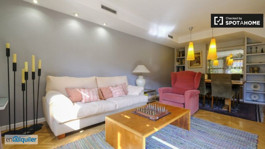 Los hermosos balcones _porque quiero espacio y estilo con balcones para arrancar_ ¿me gustará aquí? Sería difícil no hacerlo. ¿buscas un espacio habitable bellamente amueblado con ese codiciado flujo al aire libre? Este ofrece 2 pisos de diversión a la moda. ¿de Verdad? Dime más te encantará el flujo interior-exterior. El primer balcón se abre desde la sala de estar grande y cómoda, y el segundo desde una de las habitaciones de arriba. Entretener aquí será mágico: una cocina grande y totalmente equipada sirve un magnífico comedor. ¡entonces deja que la diversión fluya al balcón, o incluso al área de la piscina compartida! Creemos que este apartamento es ideal para una familia o profesionales. Es especialmente genial si buscas un vecindario más tranquilo pero prometedor. Prosperidad está muy bien conectada con la ciudad, y hay una gran tienda ecológica de compras y un lugar de música clásica cerca. Sus 3 razones principales para alquilar aquí: - Este tiene todo el espacio y almacenamiento que necesitas. - el apartamento tiene dos grandes balcones para disfrutar, así como una piscina comunitaria. - Prosperidad está muy bien conectada a los principales centros de transporte. Pero necesitas saber esto - Hay una lavadora privada, pero no hay secadora - no hay problema, solo elija un balcón para colgar la ropa. Su inspector de viviendas, Eliana, dijo: _ "me encantó este apartamento. Es muy grande y los pisos de parquet y muebles elegantes son hermosos. ”_ Ayúdame a decidir Este es un hermoso apartamento de 3 dormitorios en el tercer piso en la calle del Corazón de María, Madrid. Cuenta con una cocina grande y totalmente equipada, elegantes salas de estar, 2 balcones, estacionamiento y acceso a una piscina comunitaria. Guau. Esta propiedad es ideal para una familia o un par de profesionales. Estarás en una zona tranquila pero podrás disfrutar de muchas opciones para ir de compras, comer y transportarte.