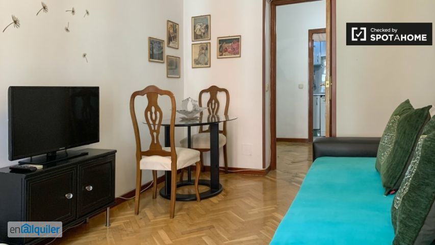 Este precioso apartamento de 1 dormitorio está disponible para alquilar en la encantadora zona de Universidad, Madrid. Está completamente amueblado e incluye comodidades esenciales como aire acondicionado individual y calefacción eléctrica. La propiedad cuenta con un diseño exterior elegante y un balcón donde los inquilinos pueden relajarse al aire libre. Se admiten mascotas y se permite fumar dentro del apartamento. Disfrute de la comodidad de una cocina equipada y del uso del wifi incluido durante su estancia. El anuncio ha sido verificado personalmente por Spotahome, lo que garantiza calidad y fiabilidad. Universidad es un vibrante barrio de Madrid, situado cerca de numerosas atracciones, como el Nudo Norte de Madrid, el Monasterio de las Benedictinas de San Plácido y la Galería Sabrina Amrani, todos a poca distancia a pie. La ubicación es ideal para quienes disfrutan explorando lugares de interés cultural, monumentos históricos y arte local. ¡reserve su estancia en este animado barrio hoy mismo!