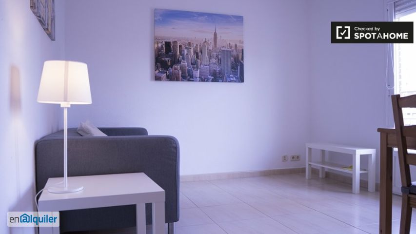 ¿buscas un acogedor apartamento de 1 dormitorio en Pinar del Rey, Madrid? Este apartamento amueblado incluye cocina equipada, balcón privado, ascensor y la verificación de Spotahome. Ten en cuenta que no hay internet disponible. Se admiten parejas. El barrio de Pinar del Rey ofrece fácil acceso a diversos servicios. Cerca, encontrarás la estación de metro Parque de Santa María para un rápido transporte urbano. Los amantes de la gastronomía podrán disfrutar de restaurantes como el asador Cocina Morenoti, el restaurante de comida rápida Bengal Doner Kebab y el Bar Nuevo m-40. También encontrarás supermercados como Supermercados Barreiro y Condis, a pocos pasos.