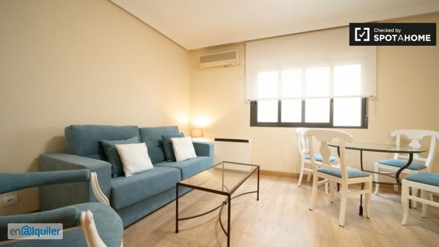 Castellano Elegante apartamento en el centro de Madrid Apartamento bien iluminado en una 2Da planta en finca con ascensor. Dispone de espacioso salón, cocina americana y dormitorio con dos camas individuales. Se encuentra en Cortés. Tiene el jardín botánico a 550m y el parque el Retiro a 800m. Tiene las estaciones lavapies (línea 3) a 800m y la estación del arte (línea 1) a 350m. También cuenta con varios teatros, restaurantes y supermercados alrededor. Inglés Elegante apartamento en el centro de Madrid. Luminoso apartamento en el segundo piso de un edificio con ascensor. Cuenta con una amplia sala de estar, cocina americana y dormitorio con dos camas individuales. Se encuentra en Cortés. Tiene el jardín botánico a 550m y el parque el Retiro a 800m. Cuenta con la estación de Lavapiés (línea 3) a 800m y la Estación del Arte (línea 1) a 350m. También cuenta con varios teatros, restaurantes y supermercados alrededor.