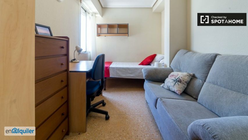 Disfruta de la vida en este gran apartamento de 5 dormitorios con habitaciones en alquiler en Valencia. Hay mucha luz natural, ya que se encuentra en el piso 14 del edificio. Las habitaciones son simples y funcionales, pero tienen un montón de espacio de almacenamiento. Perfecto si vas a estudiar en Valencia. Muy cerca de la playa de Malvorrosa, este apartamento es un muy buen lugar para relajarse después de un largo día de estudio o trabajo. Su supermercado más cercano es el Mercadona, a solo dos cuadras de distancia. También hay muchos bares y restaurantes para mantenerte ocupado por las noches.