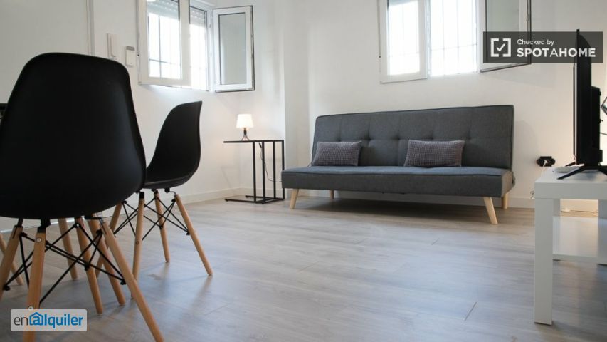 Este acogedor apartamento de 1 dormitorio en Pueblo Nuevo está completamente amueblado y ofrece una vida cómoda. Está equipado con aire acondicionado individual, tanto para calefacción como para refrigeración. La cocina está lista para cocinar e incluye lavadora, lo que aumenta su comodidad. Incluye wifi y la propiedad es exterior, lo que le proporciona abundante luz natural. La propiedad se encuentra en Pueblo Nuevo, un dinámico barrio de Madrid. Cerca, encontrará el Mercadona, que ofrece alimentos frescos y artículos de primera necesidad. Entre las opciones gastronómicas se incluyen Papa John's Pizza y Bar la Goleta, además de otros restaurantes en las inmediaciones. La zona es ideal para familias y está bien comunicada, lo que permite una agradable vida urbana.