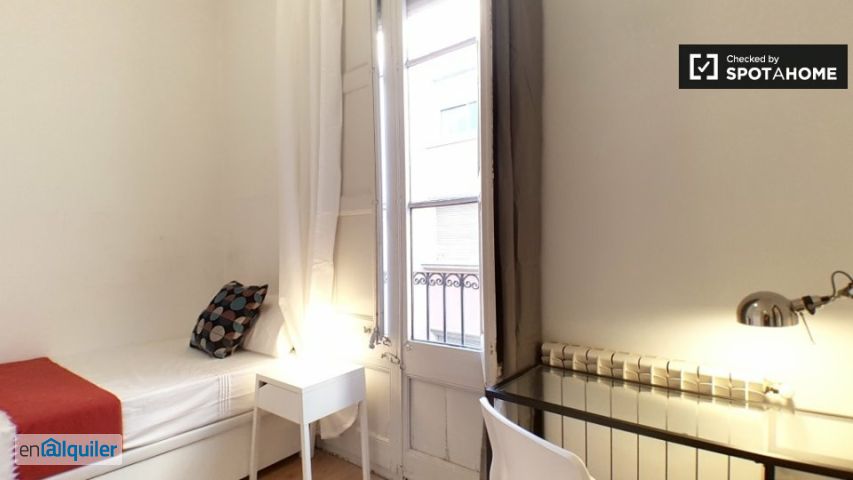 Hay habitaciones soleadas, algunas con balcón, disponibles para alquilar en el centro de Gràcia. La propiedad de 6 dormitorios tiene una elegante sala de estar con preciosas paredes de ladrillo visto, donde encontrará una pequeña mesa de comedor y un espacio de estantería. La cocina tiene todo lo esencial, incluido un horno, una estufa de gas, una lavadora, un microondas y un gran frigorífico con congelador. Todas las habitaciones en alquiler son luminosas y tienen mucho espacio de almacenamiento debajo de la cama. Hay 1 baño completo en el apartamento, que tiene azulejos preciosos, una bañera grande y un toallero con calefacción. Además, hay un segundo medio baño con inodoro. Gràcia es uno de los barrios céntricos más populares de Barcelona. En los alrededores del apartamento encontrará muchos restaurantes, cafeterías, bares y tiendas, así como varios parques pequeños.