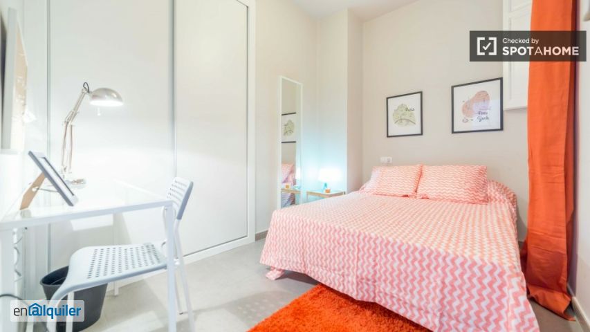 Este 130 m², apartamento de 5 dormitorios ofrece habitaciones muy elegantes y confortables en alquiler. El apartamento está totalmente renovado y cuenta con una decoración y un diseño muy moderno y elegante. Cada habitación cuenta con diferentes características, algunas con balcón, sofá, o en el baño. El área principal es la cocina compartida grande y abierta. La cocina está totalmente equipada con electrodomésticos nuevos. Hay 1 baño completo para compartir y 1 cuarto de baño. El apartamento está situado en el animado barrio de l'eixample. El apartamento está rodeado de bares, tiendas y restaurantes, y está a sólo 15 minutos a pie del centro de la ciudad. Esta área es también el lugar para estar para el festival anual de Les Falles de Valencia. 25 m² 25 m²
