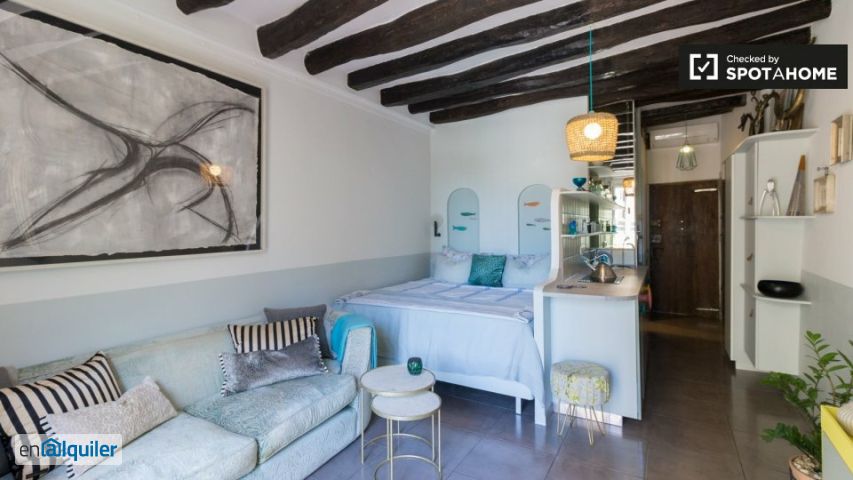 Bienvenido a este elegante estudio en Sant Pere Santa Caterina i la Ribera, Barcelona. Este estudio, completamente amueblado, ofrece comodidades modernas para su comodidad, incluyendo una cocina equipada con lavavajillas y horno, lavadora y aire acondicionado individual. La zona exterior garantiza luz natural y aire fresco, además de un balcón o terraza privados. Los gastos de electricidad, agua, gas y wifi están incluidos, para mayor comodidad. Se admiten mascotas; sin embargo, está prohibido fumar. La limpieza periódica es responsabilidad del inquilino. Spotahome ha verificado personalmente esta propiedad para su tranquilidad. Ubicado en Sant Pere Santa Caterina i la Ribera, el apartamento está cerca de lugares de interés turístico de renombre. A poca distancia, descubra la Estatua de Lucrecia, el Monumento a Antonio López y López y el Fossar de Les Moreres. Pasee por el Paseo del Born o admire el Roble Encantado en las cercanías. El barrio combina cultura y entretenimiento, ideal para explorar la vibrante vida urbana de Barcelona.