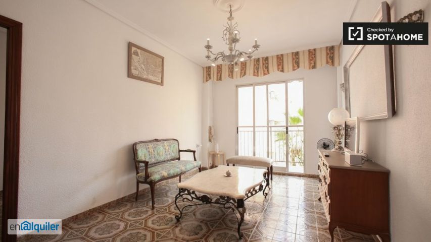 Este hermoso apartamento de 2 dormitorios tiene un balcón privado que da a la calle. La sala tiene un banco para sentarse, una mesa de café, un televisor y un juego de cajones. La cocina totalmente equipada tiene una mesa con capacidad para dos, horno, estufa y microondas. Hay un baño compartido que tiene una amplia ducha, inodoro, bidé, lavabo y espacio para guardar cosas debajo del lavabo. Este apartamento está al norte del centro, a solo 15 minutos a pie de un paseo verde y exuberante. Justo al lado de esa pasarela hay un gran centro comercial, que incluye un supermercado Mercadona. También estarás al lado de la atención de urgencias Centro Sanitario Campanar. Usted puede encontrar un gimnasio y una piscina a poca distancia.