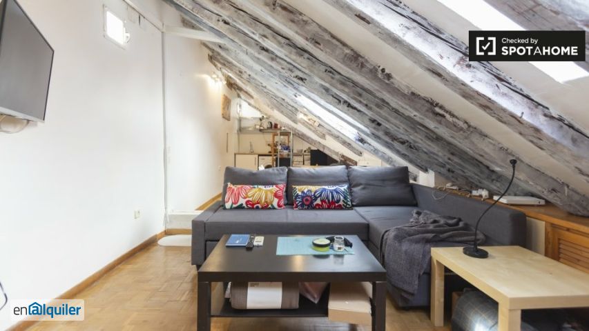 El ático de los sueños _porque es el que siempre quisiste_ ¿me gustará aquí? Absolutamente. Estás en una zona muy céntrica de Madrid y tienes un estudio reformado y de buen tamaño para ti. ¿de Verdad? Dime más le encantarán todas las ventanas de tragaluz que mantienen su estudio soleado y fresco y las comodidades modernas que harán que moverse sea rápido y fácil. Creemos que esta es una excelente opción si está buscando vivir solo sin sacrificar las comodidades modernas que ama. Sus 3 razones principales para vivir aquí: - Nos encantan todas las ventanas de claraboyas que agregan carácter y dejan entrar mucha luz natural. - Tiene más de una cocina con horno y lavadora. - te encantará la ubicación en una hermosa plaza y rodeado de varias paradas de metro. Pero necesitas saber esto - el elevador solo llega al 4To piso, por lo que tendrá que subir 1o escalones. Su inspector de viviendas, Marcos, dijo: _ “realmente me encantó este hermoso estudio. Eres bastante central. ”_ Ayúdame a decidir Este es un quinto piso, estudio en la calle de Trafalgar, Madrid. Esta es una propiedad renovada en un animado y céntrico distrito de Madrid. Es perfecto para ti si quieres vivir solo y tener un lugar tranquilo para retirarte después de un ajetreado día en la ciudad.