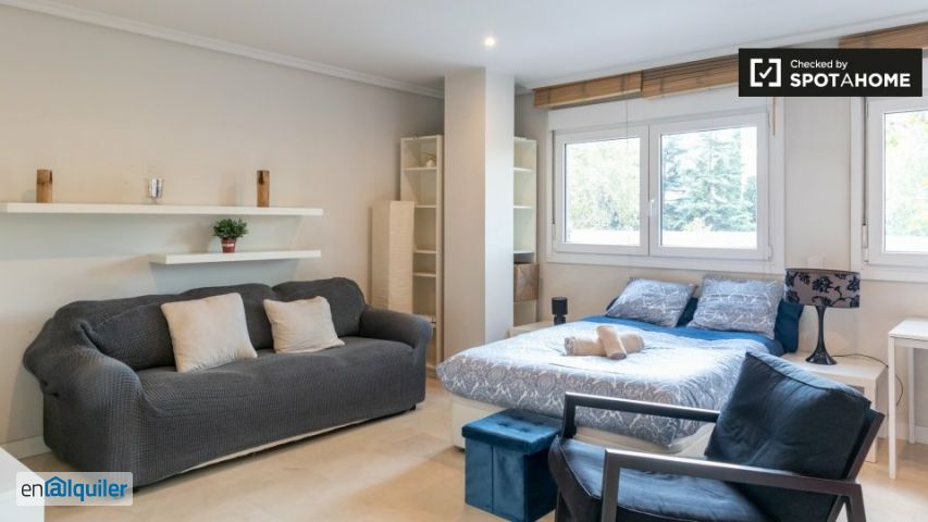 Disfruta de la comodidad de este estudio amueblado en Madrid. Ideal para profesionales, parejas y estudiantes, este estudio ofrece cocina equipada, lavadora privada, aire acondicionado central y ha sido revisado por Spotahome para tu comodidad. Los gastos no están incluidos en el alquiler. Ubicado en Estrella, Madrid, el alojamiento está cerca de restaurantes como Rodilla, Parador del Jamón y Bendetta. Entre las atracciones turísticas cercanas se incluyen los Murales de Los Beatles y la Torre España.